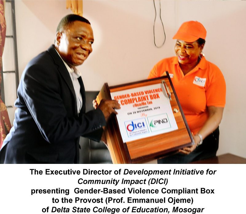 A GBV Complaint Box was handed over to the Provost of the Delta State College of Education during advocacy visit to the College by Development Initiative for Community Impact (DICI).