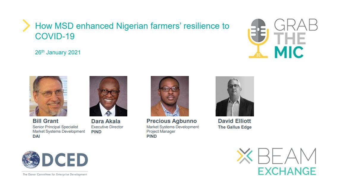 The BEAM Exchange Grab the Mic webinar hosted on January 26, 2021 on ‘How Market Systems Development (MSD) Enhanced Nigerian farmers’ Resilience to COVID-19’ was an insightful forum that featured global development experts – William Grant of DAI Global, Dr. Dara Akala and Precious Agbunno of PIND Foundation and David Elliot of the Gallus Edge.