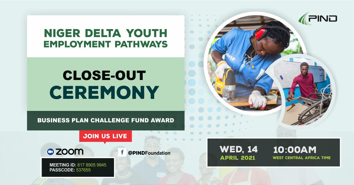 Join the Foundation for Partnership Initiatives in the Niger Delta (PIND) on Wednesday, 14 April 2021 at 10:00am (WAT) in a ceremony to officially close out the Niger Delta Youth Employment Pathways (NDYEP) project that has demonstrated model trails for employment through competency based skills training of marginalized youth since 2017.