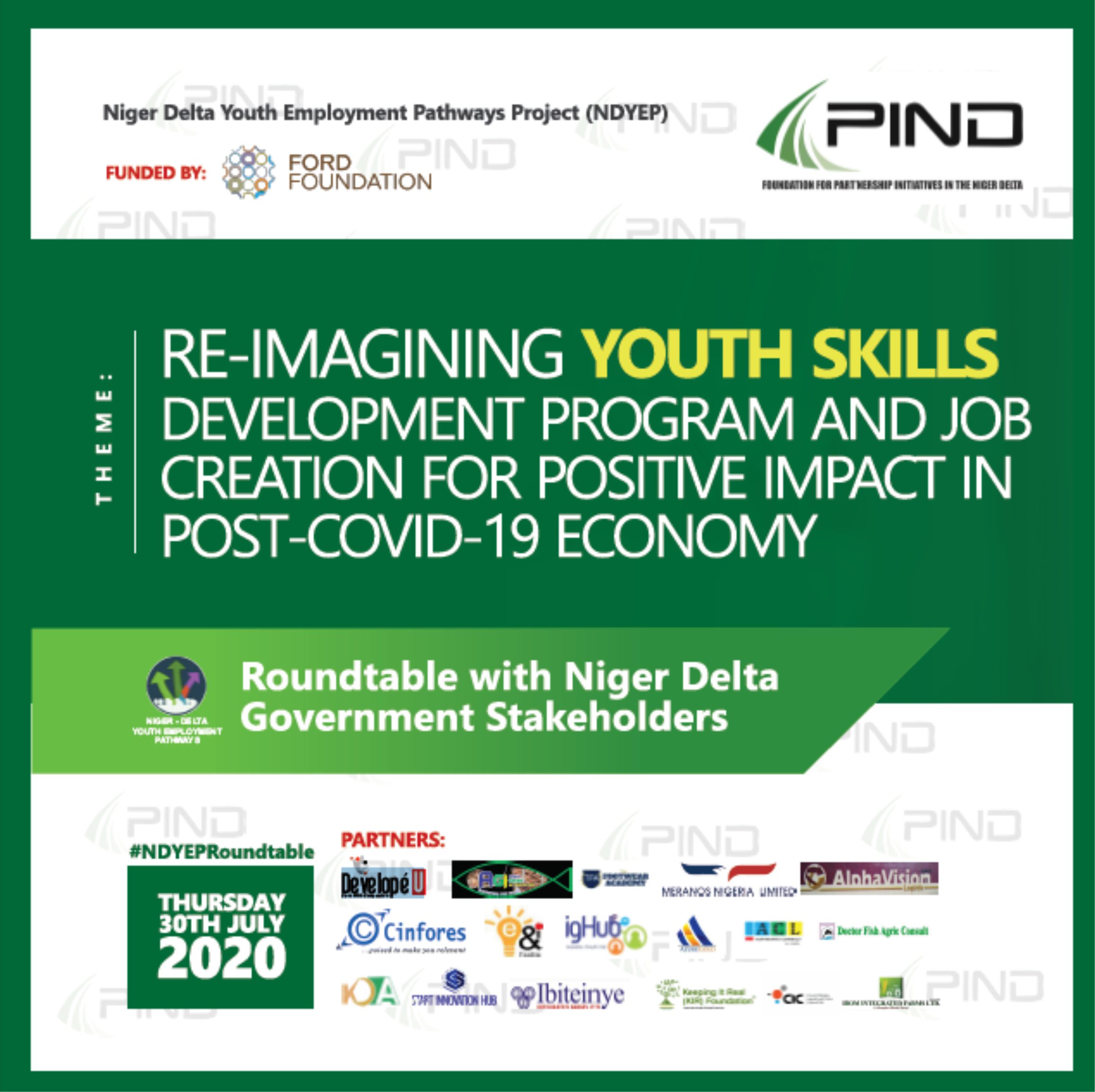 The Government Stakeholder Engagement on Skills for Youth Employment in the Niger Delta is organized by PIND Foundation under the NDYEP project. This Roundtable will bring together representatives (Commissioners, Permanent Secretaries, and Directors) of MDAs engaged with in the nine Niger Delta States that can influence and catalyze youth skills development towards youth employment and employability in their States. It will also feature representatives from the private sector, international development organizations, project advisory committee members and implementing partners, media and PIND staff as key stakeholders of the project.