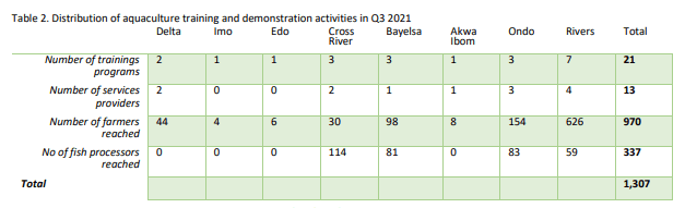 In the quarter under review, PIND deepened its work with the network of aquaculture service providers to further create awareness on the use of quality inputs and to build the capacity of fish farmers/processors, particularly in the GMOU communities to access funds for equipment and input purchase. PIND also continued to provide support to selected hatchery operators to produce and promote quality fish seeds for farmers, in addition to overseeing and tracking the expansion of the training on good pond management and business practices to more farmers and processors, through service providers and input companies in the region.