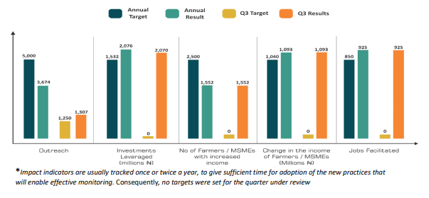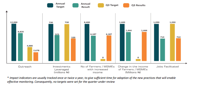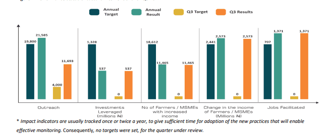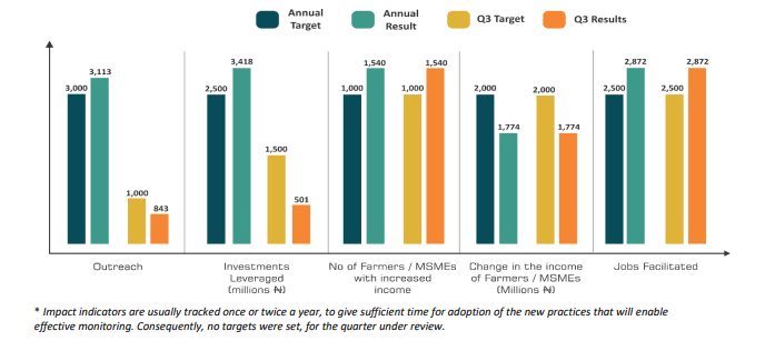 - Also, within the quarter, PIND leveraged N5.76 billion from direct farmers and MSMEs investing in the adoption of intervention activities through equity/debt financing. This makes the annual funds leverage as at Q3 2021 N8.93 billion (N5.5 billion – Equity and N3.4 billion – debt), representing 102% of the 2021 annual target of N8.73 billion.