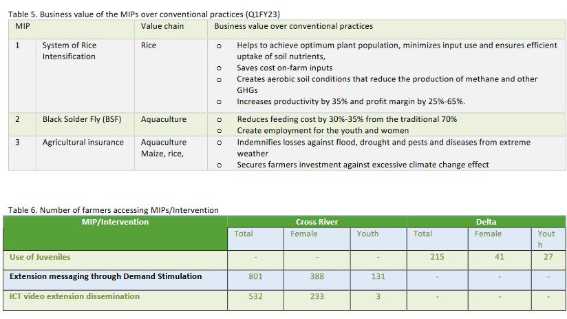 This strategic training was planned to prepare the MSMEs to meet farmers’ demand for the MIPs and extension services especially during the upcoming cropping season. The capacity building has been quite impactful judging from the current solar home system (SHF) success story emerging from Cross River and Delta States. Also 35 MSMEs within the 20 cohorts were commercializing the MIPs (Use of Juveniles, Extension messaging through Demand Stimulation, ICT video extension dissemination) in Q1 of FY23. And across the two states, the 35 MSMEs commercialized the Activity’s MIPs and disseminated extension and advisory services to 1,548 smallholder farmers in this quarter.