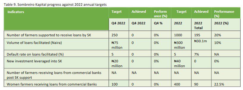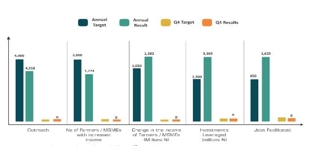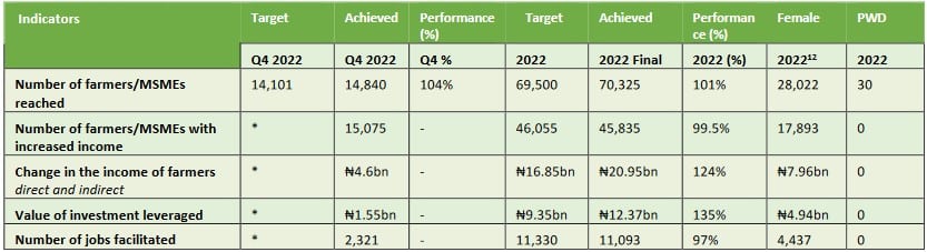 o Change in the income of farmers: Similarly, the 2022 net attributable income change for aquaculture farmers/MSMEs as of Q4 was estimated to be ₦1.28billion, representing 122% performance of the 2022 target of ₦1.05billion.