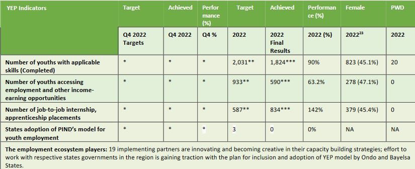 PIND continued to scale-up the YEP model into other states. 1,824 youths (45% female, 1% PWD) graduated from the Youth Employment Pathways program in Abia, Akwa Ibom, Delta and Rivers States in 2022, following training to build technical skills (with embedded soft skills training for workplace preparedness) in agriculture, ICT, building construction and services. 590 of them have already accessed employment and income earning opportunities, while 602 of them are currently undergoing internships and apprenticeships.