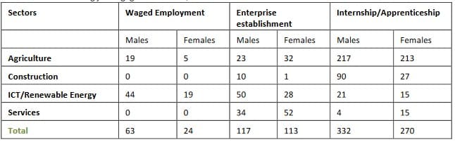 More people from the ICT sector (141 persons) recorded a high number of linkages to jobs and business start-ups, followed by the Services sector (86 persons). These categories were more inclined to pursue entrepreneurship start-ups. Majority of internships/apprenticeships placements were in the Aquaculture sector, recording the highest number of persons (430). Only 117 persons were placed under the building construction. Continuous efforts are being made to support the transition of the remaining youths as well as those on internships or apprenticeships to transit into waged employment or entrepreneurships. The table below provides details of their engagements: