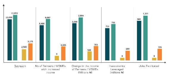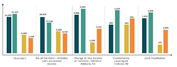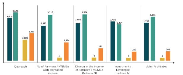 o Change in the income of farmers: Consequently, the net attributable income change (NAIC) of these farmers/MSMEs on the project was estimated to be ₦20.95 billion, representing 124% performance of the 2022 target of ₦16.85 billion.