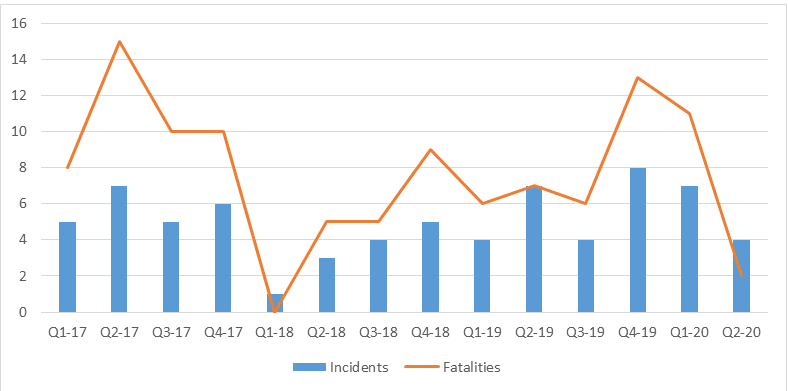 Communal tensions, ethnic nationalist sentiments, and land disputes continue to be a persistent feature of the conflict landscape in Abia State. According to a report by the Foundation for Partnership Initiatives in the Niger Delta (PIND), there was an increase in reported incidents of conflict risk and violence in Abia state in from April to June 2020, compared to January to March 2020. Abia was among the least violent States in the Niger Delta during the period, based on reported fatalities. Ikwuano and Aba North LGAs had the highest levels of lethal violence in the state during the quarter. Conflict risk and violence during the period were mainly driven by criminality, communal conflict, and extra-judicial killings by security operatives[4].