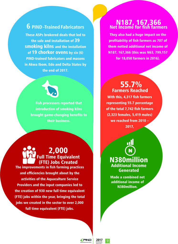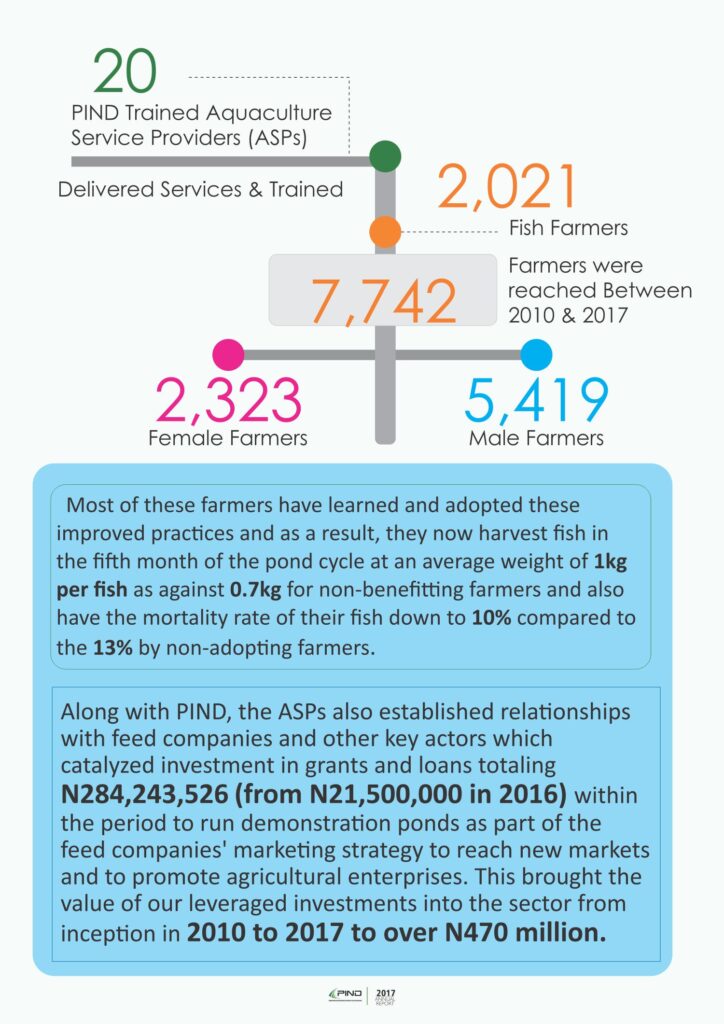 Along with PIND, the ASPs also established relationships with feed companies and other key actors which catalyzed investment in grants and loans totaling N284,243,526 (from N21,500,000 in 2016) within the period to run demonstration ponds as part of the feed companies’ marketing strategy to reach new markets and to promote agricultural enterprises. This brought the value of our leveraged investments into the sector from inception in 2010 to 2017 to over N470 million.