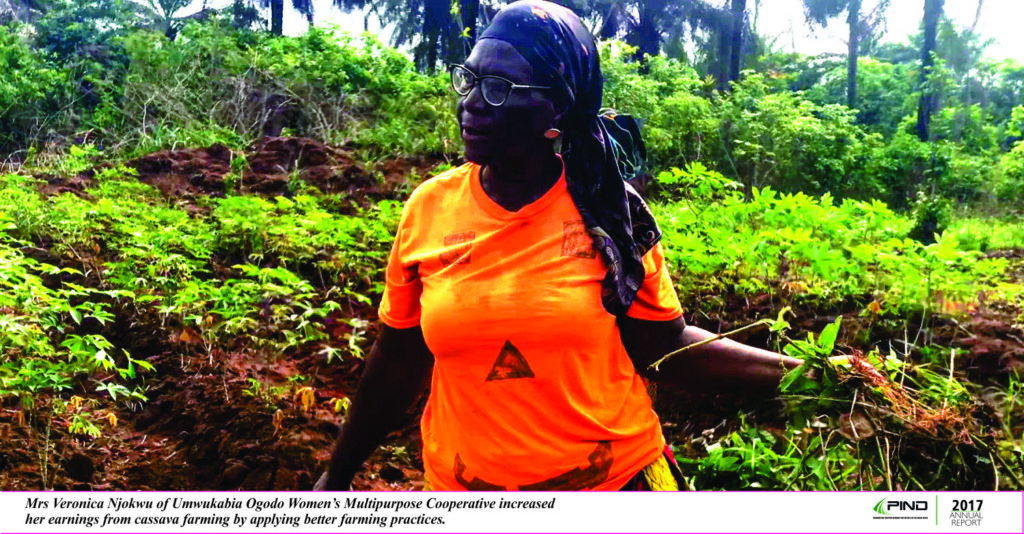 ‘’One, how to make ridges. Before we just plant ordinarily and when we don’t use ridges, the soil is hard and does not allow the cassava grow very well. Second, when PIND came in 2016, they brought Umudike, Umuahia agricultural people (National Root Crops Research Institute) and gave us improved varieties. We now planted it last year and saw that it was wonderful. Then I decided to do it on my own’’. The women also learned about using fertilizers.
